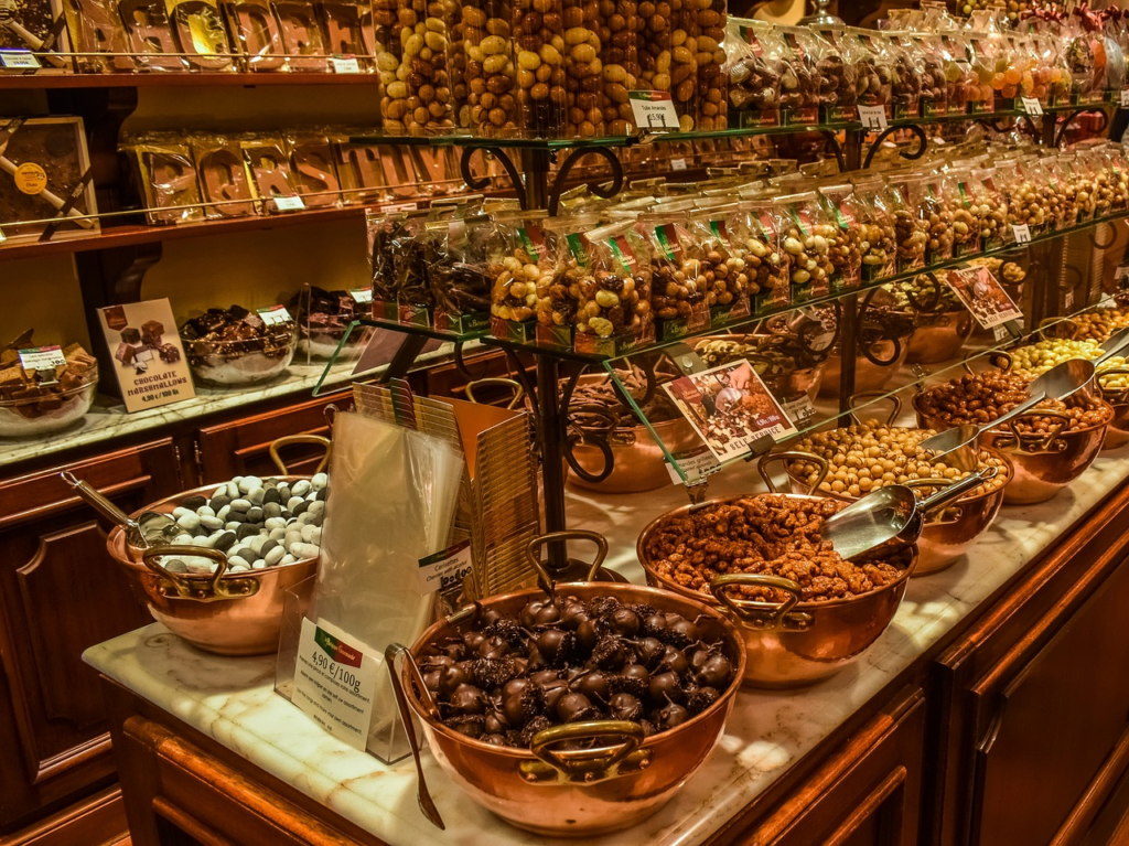 You walk in through the front door of the store. The shopkeeper (named Kai) welcomes you, hands you a chocolate sample, and then directs you to the aisles for browsing: