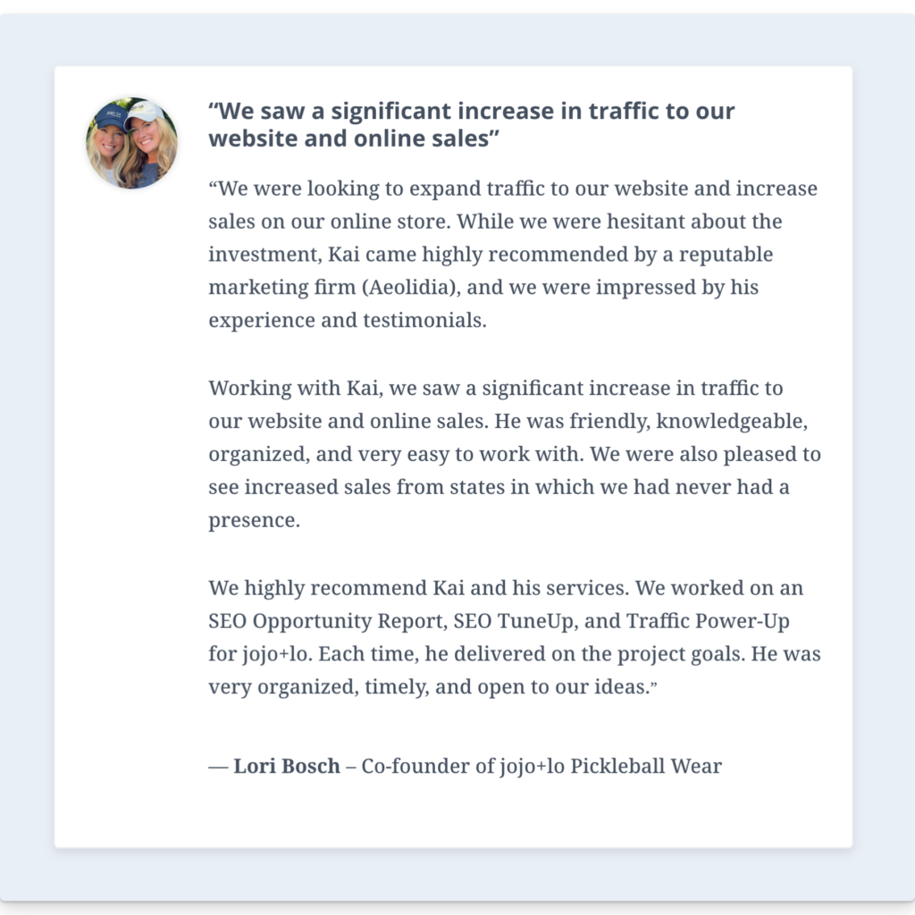 It was a delight working with Jodi and Lori on these SEO and growth projects. And if you, reader, are looking for help growing your Shopify store and getting more organic traffic, I encourage you to get in touch.