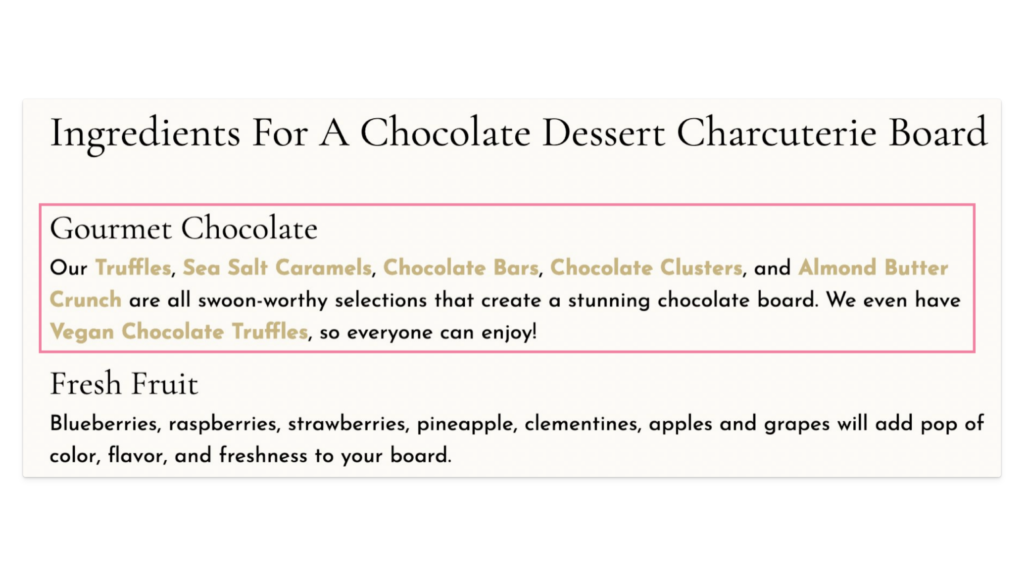 Here’s a great example of internal links on an e-commerce store pointing from a blog post to relevant products and collections (via Lake Champlain Chocolate’s guide to a DIY Chocolate Dessert Charcuterie Board).