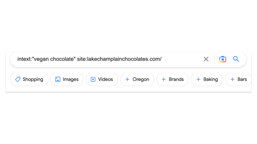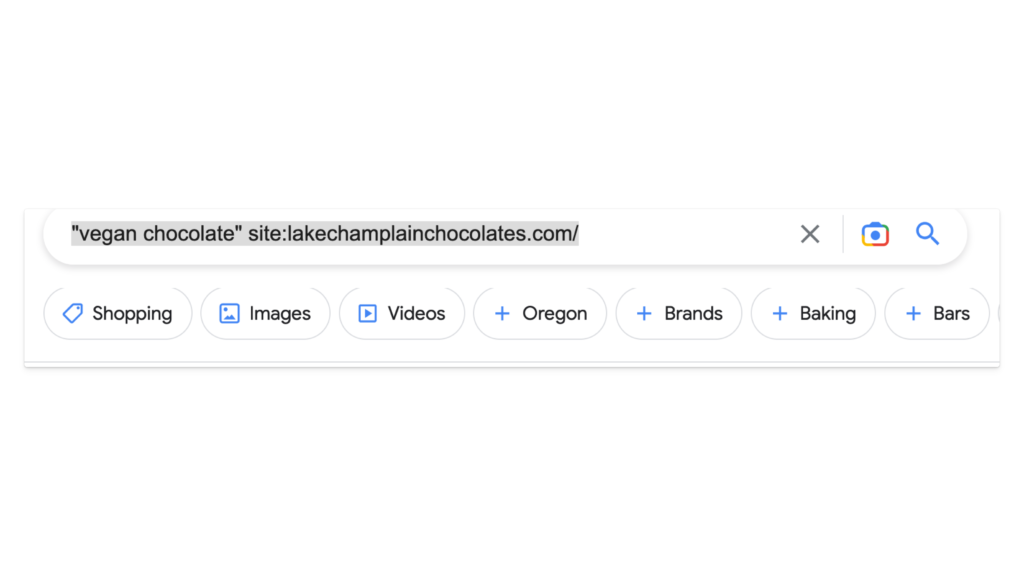 You’d search for “vegan chocolate” site:lakechamplainchocolates.com/ and that’d show you all the pages on your site relevant to that keyword.